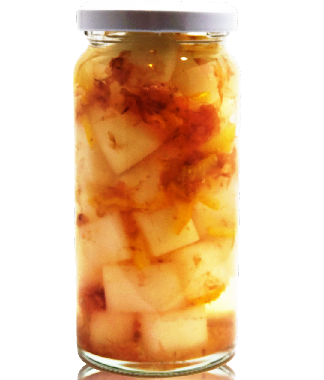 さつまいもとバニラビーンズは、芳醇なバニラの香りが特徴のピクルスで、まさにスイートポテトのようです。蜂蜜とバニラビーンズで仕上げているため、口の中に広がるのは独特の甘さと深いコク。一度食べたら忘れられない香り漂う一品です。さらに、レモンの風味が加わって、爽やかな味わいにも仕上がっています。